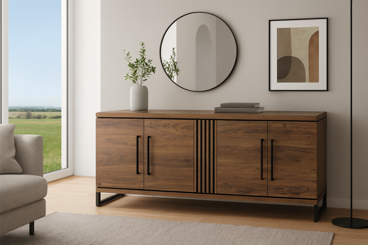 Ce Bahut est fabriqué en Lamulux, un matériau durable et résistant aux rayures qui imite parfaitement l'apparence du bois.