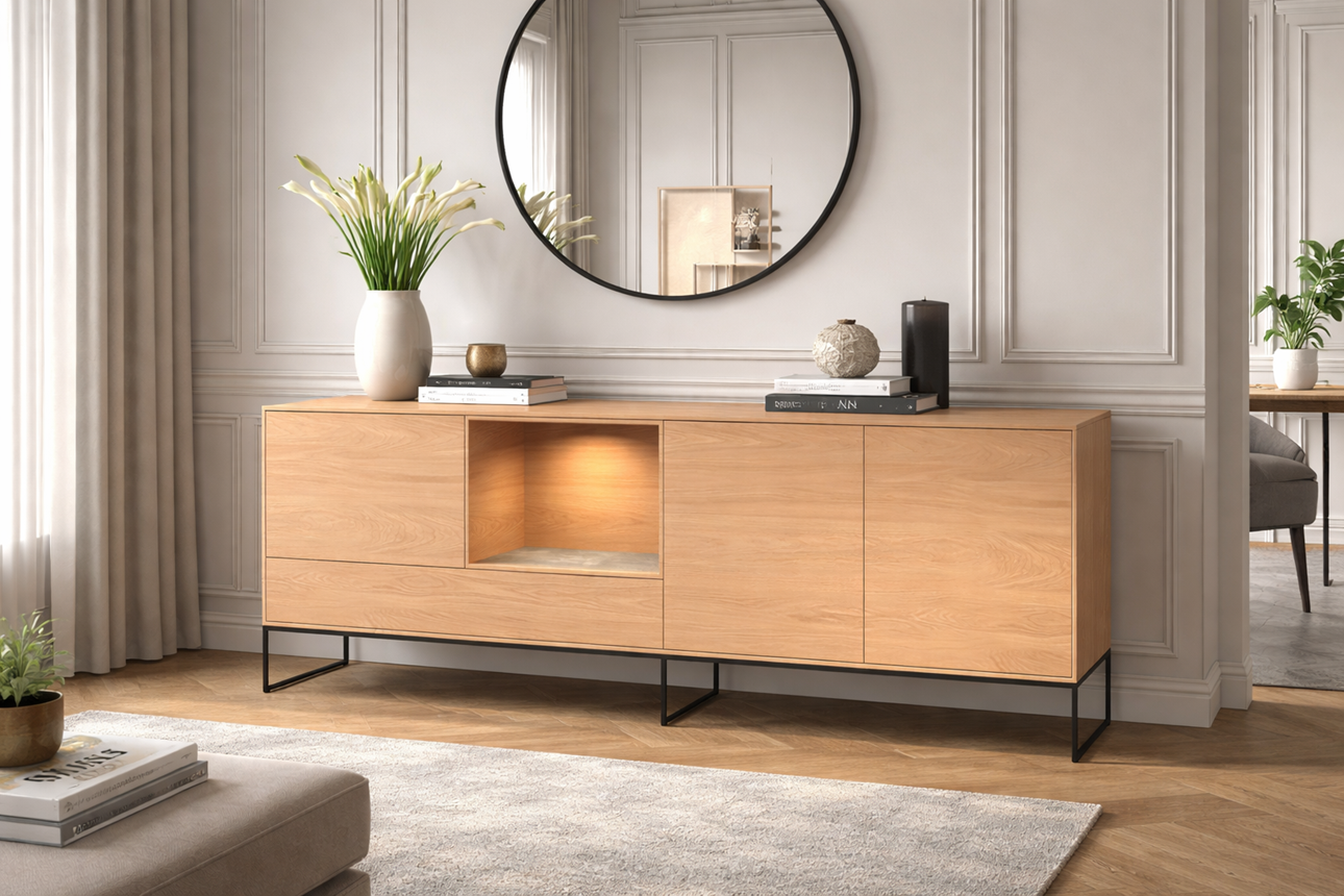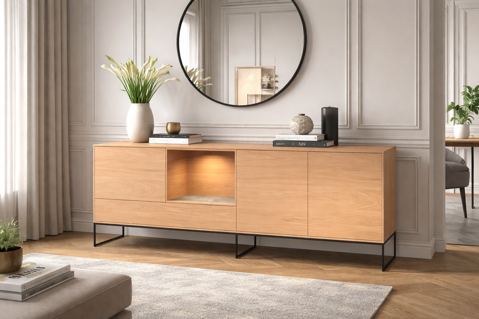 Ce Bahut "IZOLA" séduit par son design moderne et fonctionnel. L'association équilibrée entre le bois et l'acier crée une esthétique élégante et contemporaine. Polyvalent et modulable, notre collection offre des solutions de rangement pratiques sans compromis sur le style ni la qualité.