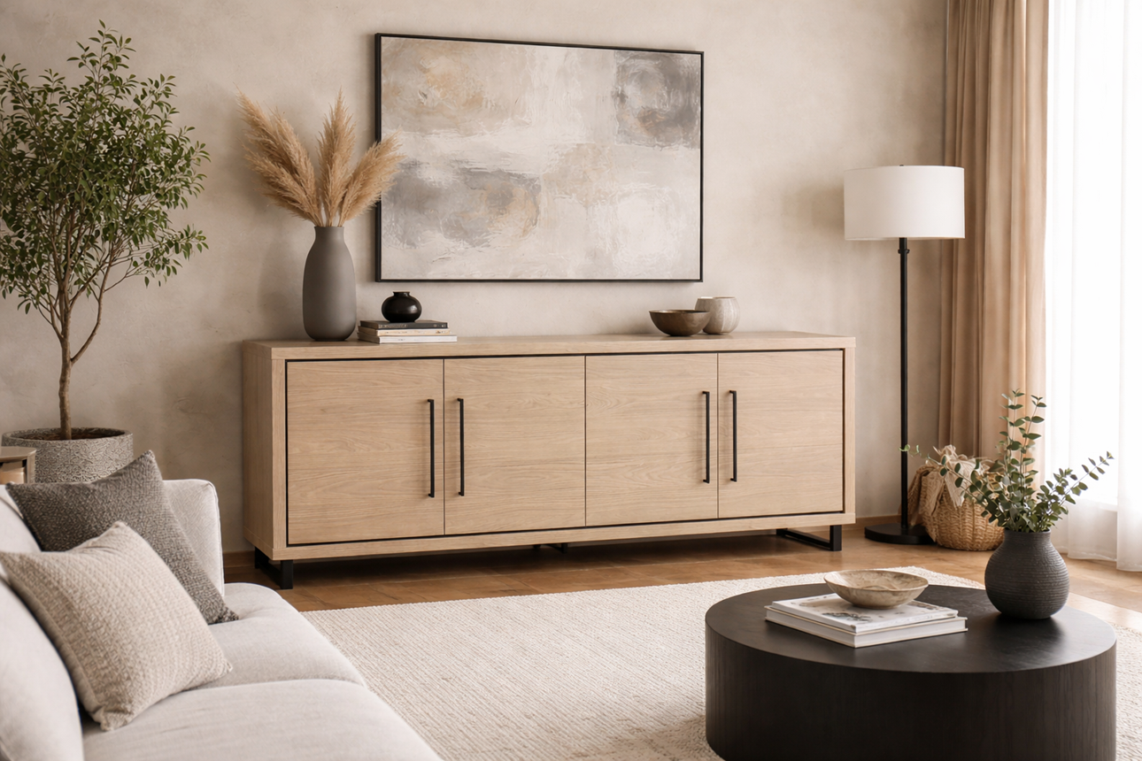 Notre Bahut "LAZIO" en Lamulux Misty Oak, associe avec élégance un design moderne et une touche chaleureuse d’inspiration campagne.