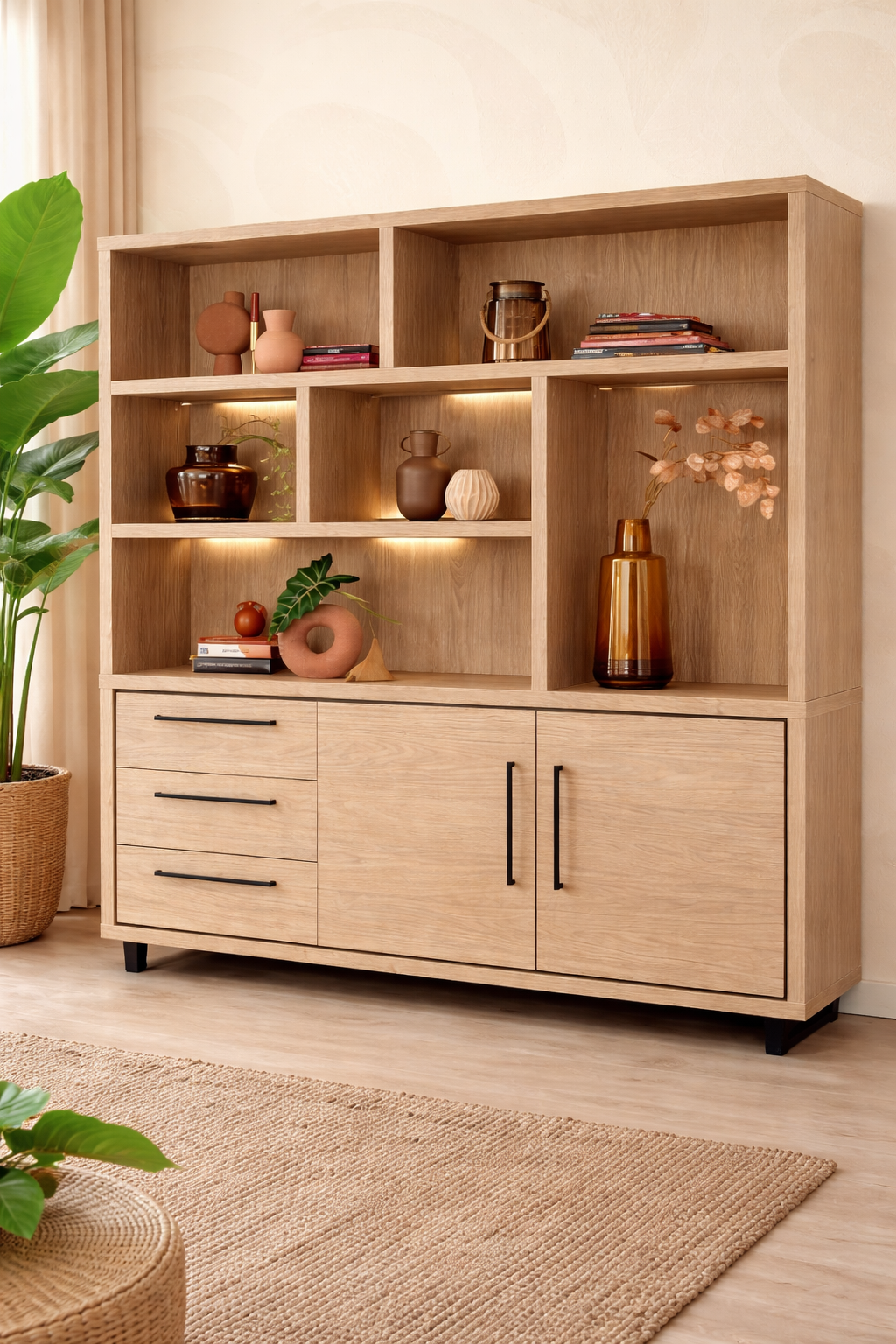 Notre Bibliothèque "LAZIO" allie harmonieusement un design moderne à une touche chaleureuse d’inspiration campagne. Fabriquée en Lamulux durable, reconnu pour sa résistance aux rayures et sa facilité d’entretien, elle repose sur des pieds en métal noir qui lui apportent une élégance contemporaine. Offrant un vaste espace de rangement, cette armoire murale est idéale pour organiser vos affaires avec style.