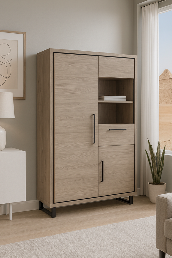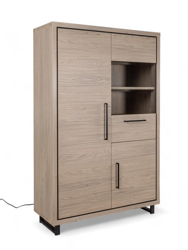 Notre Vitrine "LAZIO" allie harmonieusement un design moderne à une touche chaleureuse d’inspiration campagne. Fabriquée en Lamulux durable, reconnu pour sa résistance aux rayures et sa facilité d’entretien, elle repose sur des pieds en métal noir qui lui apportent une élégance contemporaine. Offrant un vaste espace de rangement, cette armoire murale est idéale pour organiser vos affaires avec style.