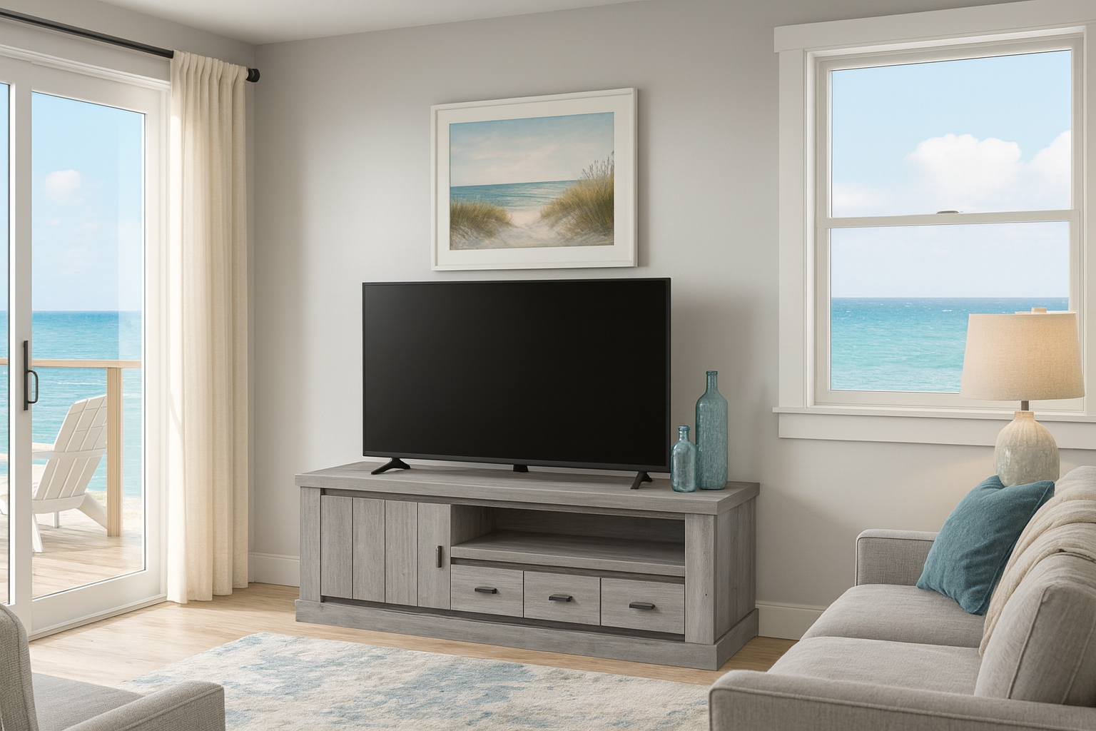 Son décor moderne et chaleureux s’intègre facilement dans tous les intérieurs. Avec sa longueur de 166 cm, il est parfaitement adapté pour accueillir un grand écran.