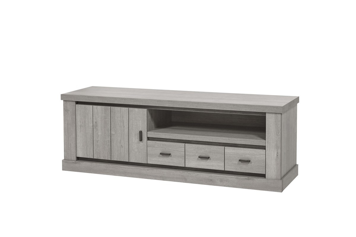 Découvrez notre meuble TV "MATHIEU" en finition béton, doté d’une porte, d’un tiroir et d’une niche ouverte.
