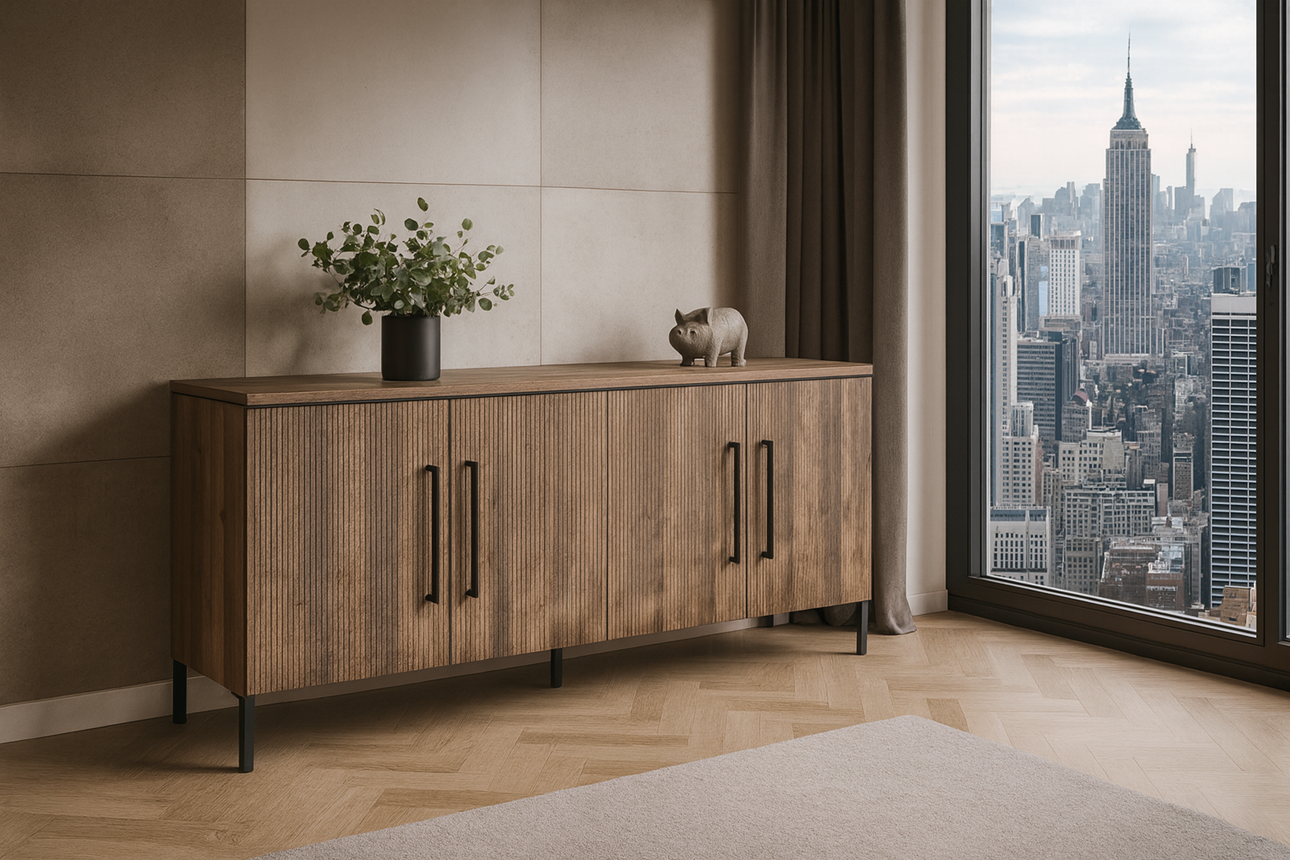 Notre Bahut "NAPOLI" allie élégance et modernité avec son revêtement en Lamulux Mokka. Ses quatre portes, dotées de charnières à fermeture douce (soft-close), offrent un confort optimal et une utilisation en toute sérénité.