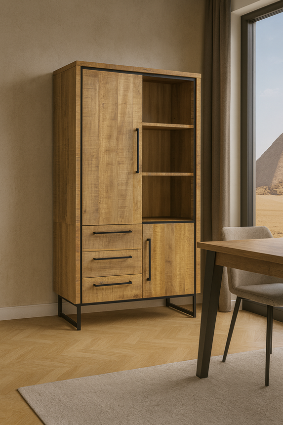 Le Meuble "RIMINI" séduit par son élégance contemporaine et son revêtement en Lamulux Mango, à l’aspect chaleureux et authentique. Ses deux portes et trois tiroirs, dotés d’un système de fermeture douce (soft-close), assurent une utilisation fluide et silencieuse.
