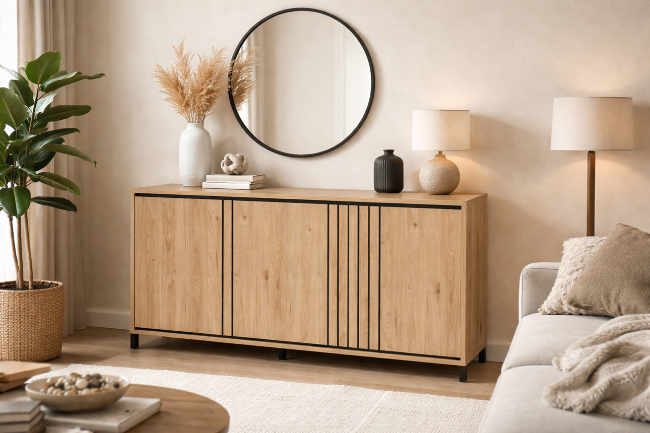 Découvrez notre Bahut "TRAVIS" réalisé en mélamine dans le coloris chaleureux Castella. Les portes offrent un accès facile à de nombreux espaces de rangement. Enrichissez votre intérieur avec ce meuble contemporain, idéal pour tous les styles.