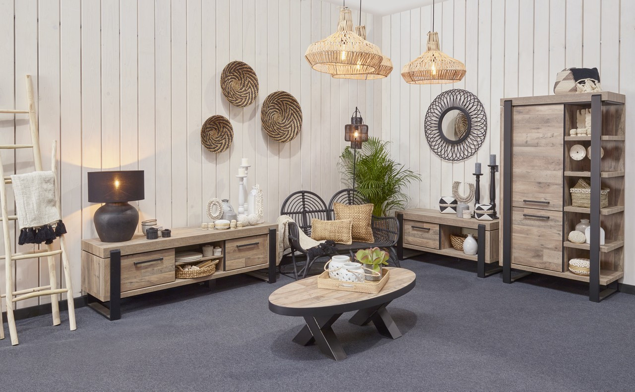Découvrez le Meuble T.V. "UDINE" en Décor Parquet Naturel. Ce meuble style industriel est pratique grâce à sa porte et la niche ouverte. Combinez ce Meuble aux autres Meubles de la même série.