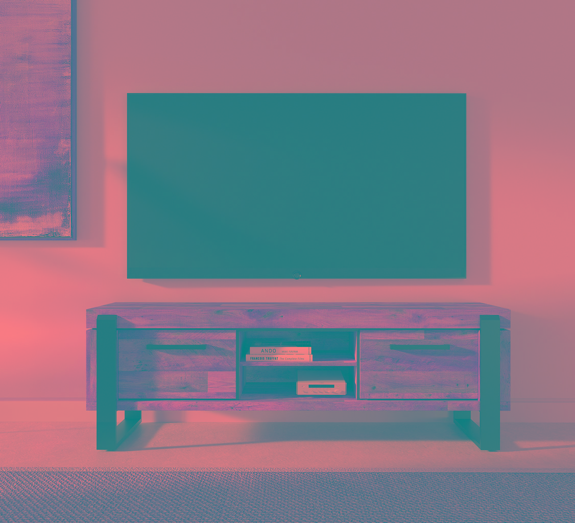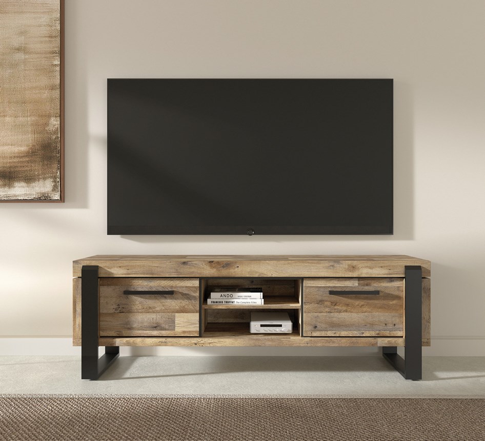 Découvrez le Meuble T.V. "UDINE" en Décor Parquet Naturel. Ce meuble style industriel est pratique grâce à ses portes et la niche ouverte. Combinez ce Meuble aux autres Meubles de la même série.